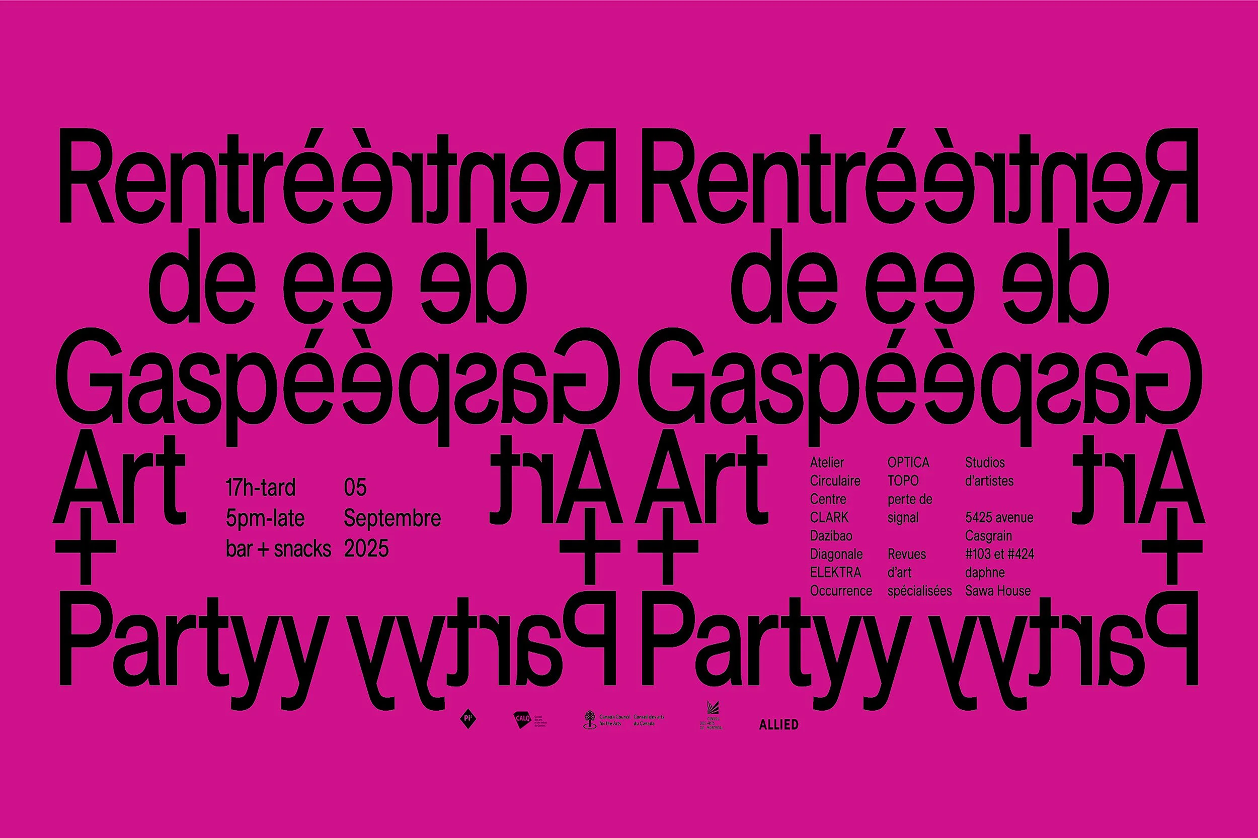 The Regroupement Pied Carré invites you to celebrate the cultural season’s launch at this not-to-be-missed event bringing together the art centers of the Pôle de Gaspé: Atelier Circulaire, Centre CLARK, Dazibao, Diagonale, ELEKTRA, Occurrence, OPTICA, perte de signal, and TOPO; daphne and Sawa House on Casgrain; artist studios on the 4th, 5th, and 6th floors of 5445 de Gaspé; the cultural magazines Ciel Variable, ESPACE art actuel, ESSE arts + opinions, Inter, art actuel, Le Sabord, and Vie des arts; as well as Céline Bureau, Grande mobilisation pour les arts du Québec (GMAQ), MOMENTA Biennale d'art contemporain, and the Regroupement des centres d'artistes autogérés du Québec (RCAAQ).